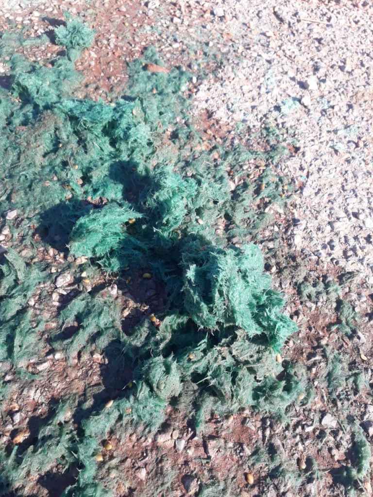 Aga eelmisel nädalal jälitas mind suur paagiauto. Noo okei, tulin oma käruga siis tee pealt kõrvale – ja tuleb see ka kõrvale. Midahekki. Kallasin oma mulla maha ja läksin ära. Järgmisel päeval – läksin jälle mulda teisaldama, paagimehed on jälle platsis. Pritsivad torust mingit ulmelist briljantrohelist löga, kohati ulatub isegi sinna tee peale kus ma käruga olin. Vähemalt ei haise, aga noh ma poleks elu sees uskunud, et sinna kahtlasse võssa kuhu ma oma mulda tahtsin depositeerida tahab keegi teine midagi veel ulmelisemat laotada. Kallasin oma mullakolakad hoopis mõnikümmend meetrit eemale üle tee ääre alla, kus on ka mingi võss. Ja läksin siis küsisin oma vigases hispaania keeles, et midakuradit nad siin teevad. Neil oli väga lõbus. See mees, kes paagi otsas survet reguleeris ei kuulnud v kuulanud eriti seda, kes voolikust tulistas, nii et vahepeal pääses voolik lahti ja seda laga lendas igas suunas. Siis nad sõimlesid jälle omavahel natuke. Igatahes see pläust on ecofibra (ma pärast guugeldasin, mingi multš aga tõesõna näeb välja nagu ufo okse). Lubasin siis, et nad võivad mu mullahunnikuid sihtida – oleks ma teadnud, ma poleks nende purustamisega vaeva näinudki (ja neile palju rohkem mulda sihtmärgiks toonud).